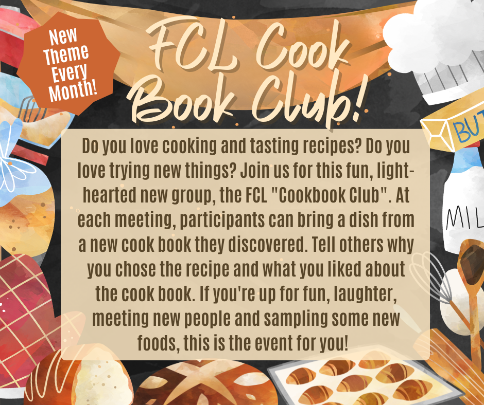 Alices book club is a monthly bookclub organized by library patron Alice Nolan and meets every 2nd Monday of the month at 3pm here at FCL! New members are always welcome; if you are interested in joining, please send an email to Alice at amron452@gmail.com
